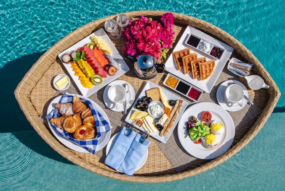 อาหารเช้าลอยน้ำพร้อมแชมเปญครึ่งขวด