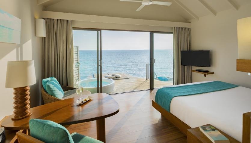 คุณสามารถเดินไปตามท่าเทียบเรือไม้ ซึ่งจะนำคุณไปสู่ Deluxe Spa Over Water Villa ที่มีทางเข้าโดยตรงไปยังแนวปะการังได้ ห้องพักมีผ่อนขนาด 42 ตารางเมตร แต่ละหลังสามารถรองรับผู้ใหญ่ได้ 2 คน โดยมีเตียงคิงไซส์และห้องน้ำพร้อมฝักบัว อ่างสปากลางแจ้งพร้อมวิวทะเล เป็นอีกทางเลือกหนึ่งในการพักผ่อนหรืออาจเลือกนอนแช่ตัวในอ่างสปาที่เปิดรับวิวของมหาสมุทรอินเดียก็ได้และในห้องพักมีอุปกรณ์อำนวยความสะดวกครบครัน เช่น เครื่องปรับอากาศ (แอร์), พัดลมเพดาน, ทีวีดาวเทียม, เครื่องเล่นดีวีดี, โทรศัพท์สายตรงภายในห้องพัก, Wifi, อุปกรณ์ชงชาและกาแฟ, ตู้นิรภัยในห้องพัก, ไดร์เป่าผม, มินิบาร์, บาร์ริมสระว่ายน้ำ
