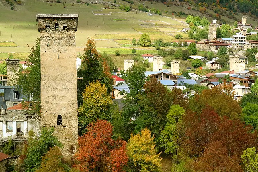 - ชุมชนปล่องไฟ เมืองเมสเตีย(Mestia) ซึ่งเป็นเมืองเล็กๆ ที่ไม่ควรพลาด ที่ตั้งอยู่ระหว่างทางไปเมืองอุชกูลลี่ เอกลักษณ์ที่ชัดเจนและโดดเด่นของเมืองนี้ คือทุกๆ บ้านจะมีหอคอยขนาดใหญ่เห็นเด่นชัด ม้จะเป็นเมืองเล็กแต่บรรยากาศสวยงามและยิ่งใหญ่มาก รายล้อมด้วยไปด้วยภูเขาลูกโตและ มีพิพิธภัณฑ์ให้ศึกษาประวัติศาสตร์อยู่ 2-3 แห่ง