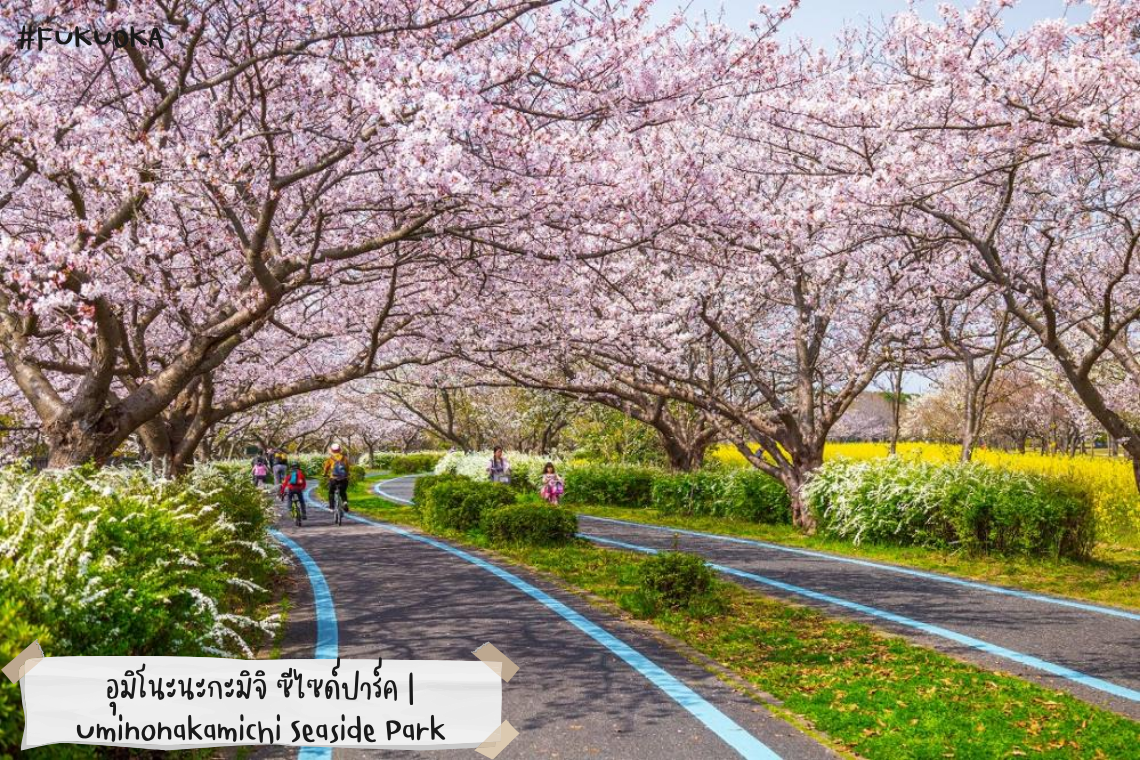 สวนริมทะเลแห่งนี้คืออุทยานแห่งชาติขนาดใหญ่ที่ตั้งอยู่ที่ “อุมิโนะนะกะมิจิ (Uminonakamichi)” ซึ่งอยู่ตรงกลางระหว่างอ่าวฮะคะตะ (Hakata Bay) และทะเลเก็งไค (The Genkai Sea) ภายในบริเวณสวนงดงามด้วยดอกไม้ที่ผลิบานอวดสีสันตามฤดูกาล และเป็นอีกหนึ่งจุดชมซากุระยอดนิยมในช่วงแรกของฤดูใบไม้ผลิ ตามจุดต่าง ๆ ภายในสวนสาธารณะมีซากุระสายพันธุ์ “โซเมโยชิโนะ (Someiyoshino)” และ “โอชิมะซากุระ (Oshimazakura)” รวมเป็นจำนวนราว 2,000 ต้น สามารถเช่าจักรยานขี่ไปตามเส้นทางจักรยานที่ให้ความรู้สึกราวกับกำลังโลดแล่นผ่านไปท่ามกลางอุโมงค์ดอกซากุระแสนสวยทีเดียว