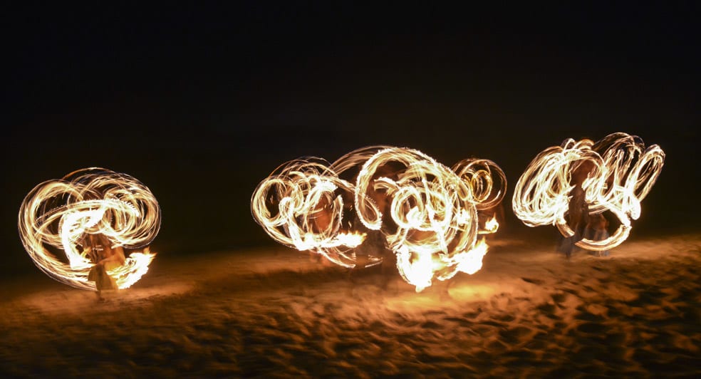 ตกเย็น เราก็มีการแสดงมาให้ได้ชมกัน ให้คุณไม่เงียบเหงาในยามค่ำคืน ด้วยดนตรีจากดีเจ โชว์ตีกลองแบบดั้งเดิม และการแสดงไฟ รวมตัวกันรอบบกองไฟ พร้อมกับ โมเลกูล่าค็อกเทลในมือและเต้นรำกันในยามราตรี