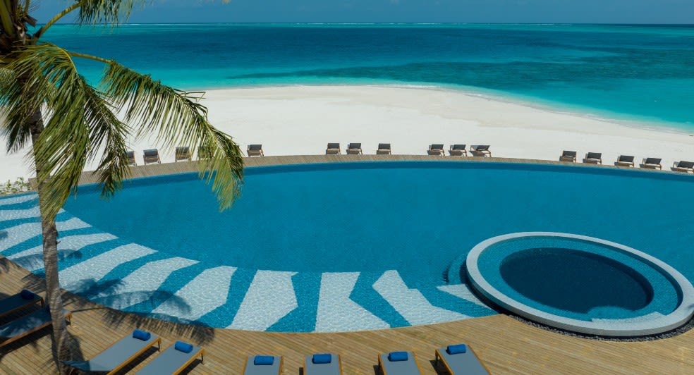 เล่นน้ำ สระว่ายน้ำหลักของรีสอร์ทตั้งอยู่กลางแจ้ง วิวเส้นขอบฟ้า บาร์ริมสระที่เสิร์ฟเครื่องดื่มเย็นๆ เก้าอี้อายชบแอดให้นั่งอาบแอดพร้อมมองวิวทะเล จากกุซซี่และสไลเดอร์