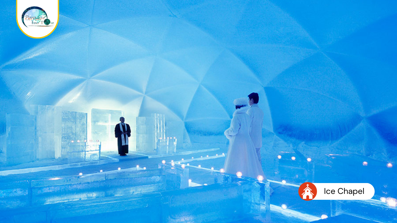 โบสถ์น้ำแข็งไร้รอยต่อที่แกะสลักออกมาจากน้ำแข็งก้อนยักษ์ทั้งชิ้น ภายใต้คอนเซปต์ “pure feelings between two people continuing uninterrupted” ทั้งไม้กางเขน ทางเดิน เก้าอี้ ทั้งหมดสร้างมาจากหิมะและน้ำแข็ง และยิ่งไปกว่านั้น โบสถ์ที่นี่ใช้ในพิธีแต่งงานจริง ๆ ด้วยนะคะ