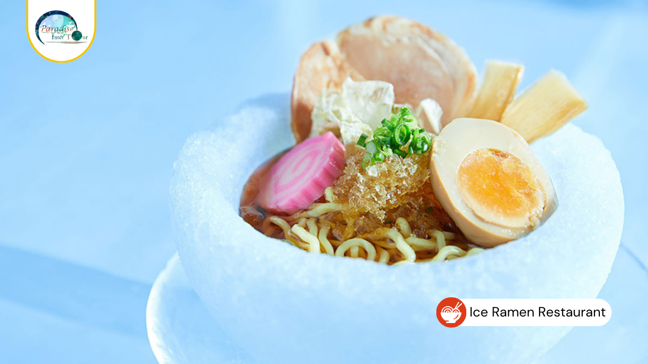 ราเมนที่ฟังดูเหมือนจะอุ่น แต่ทุกอย่างในจานเย็นไปหมด เย็นไปจนถึงชามใส่ราเมนที่ทำจากหิมะ เมนูนั้นก็คือ บะหมี่เย็น ท็อปปิ้งด้วยลูกชิ้นนารูโตะและไข่ต้มรสชาติสุดพิเศษ ในน้ำซุปก็จะมีเกล็ดหิมะกรุบ ๆ ด้วยนะคะ