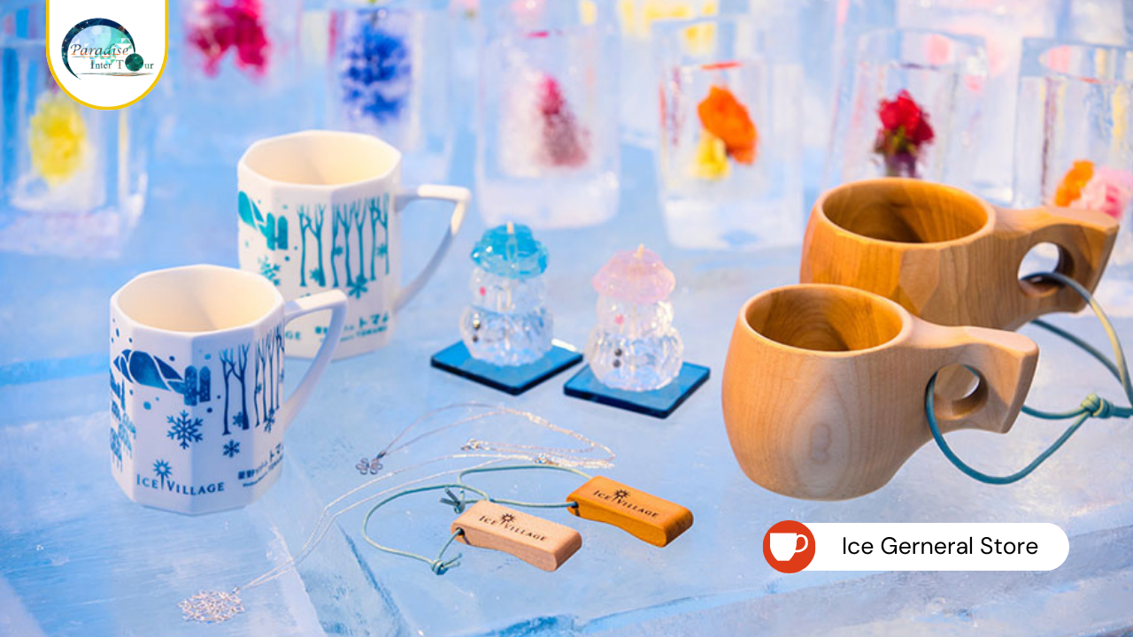 ร้านค้าที่มาในธีมของ “น้ำแข็งและหิมะ” งานคราฟต์, เครื่องประดับ, แก้วประดับลวดลายน้ำแข็งที่วางเรียงรายอยู่บนชั้นมากมาย รอให้คุณมาซื้อกลับไปเป็นของที่ระลึกและของฝากแด่คนรอบตัวคุณ
