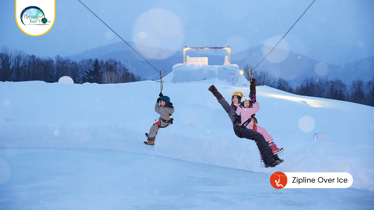 ถ้าใครไม่อยากจะลื่นไถลลงมาจากจุดชมวิวหมู่บ้าน ก็ลงมาด้วยซิปไลน์ได้เช่นกัน ซิปไลน์จะวิ่งผ่านลานไอซ์สเก็ต ให้คุณได้มองเห็นทัศนียภาพของหมู่บ้านที่แตกต่างไปจากเดิม และครอบครัวก็สามารถที่จะเล่นซิปไลน์ลงมาพร้อม ๆ กันได้ด้วย