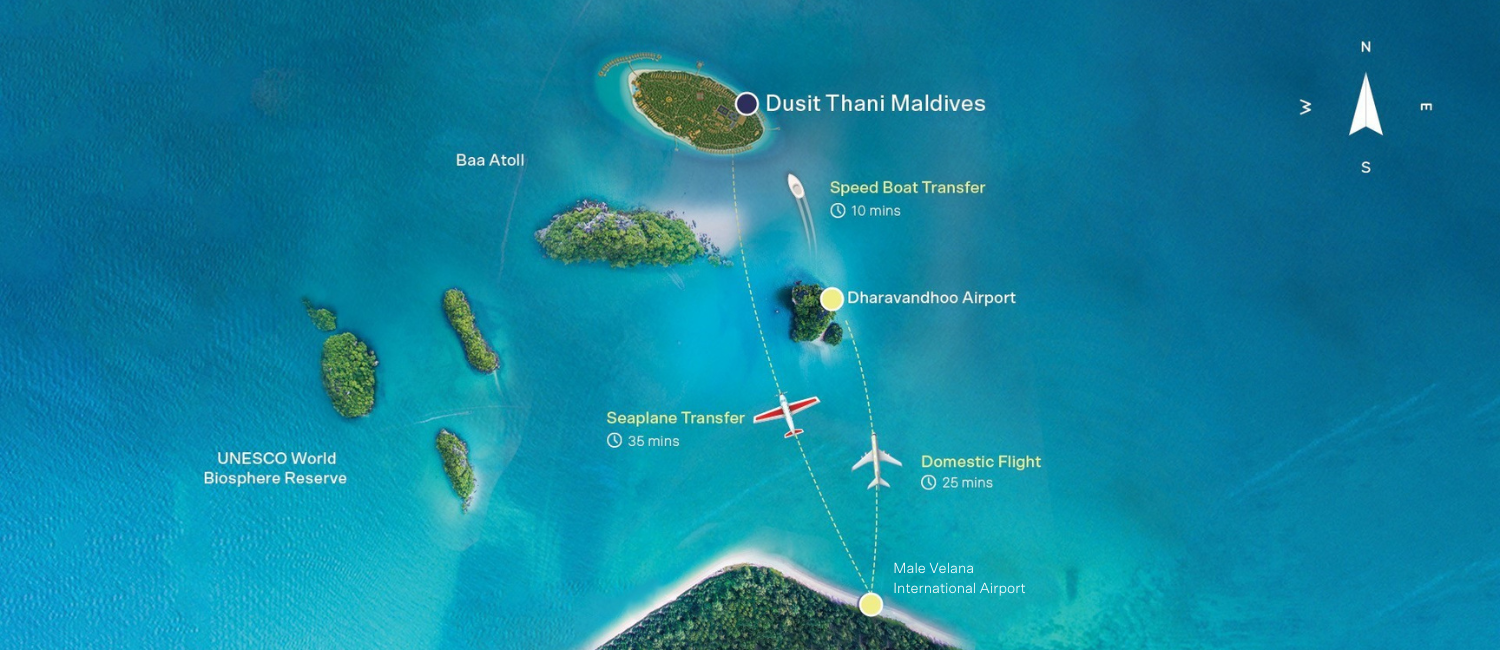 Dusit Thani Maldives ตั้งอยู่บนเกาะมุดดูห์ (Mudhdhoo) ในบาอะทอลล์ เดินทางเข้าสู่รีสอร์ตด้วยเครื่องบิน Seaplane เพียง 35 นาที หรือโดยสายการบินภายในประเทศ และนั่งเรือ Speed Boat ออกจากสนามบินดาราวันดูเข้าสู่รีสอร์ตเพียง 10 นาที