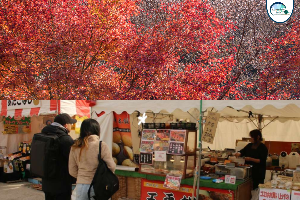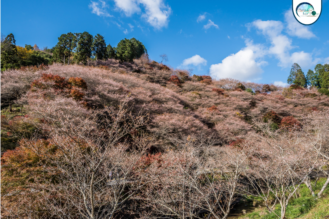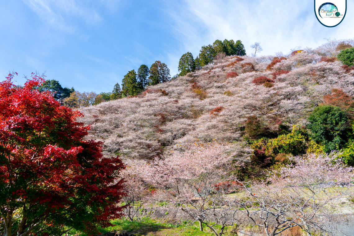 ชมวิวอันสวยงามของต้นชิกิซากุระ 1,200 ต้น ที่มีดอกชมพูตัดกับใบไม้เปลี่ยนสีในฤดูใบไม้ร่วง แต่งแต้มทั่วทั้งภูเขาด้วยสีชมพูและแดงอันงดงาม