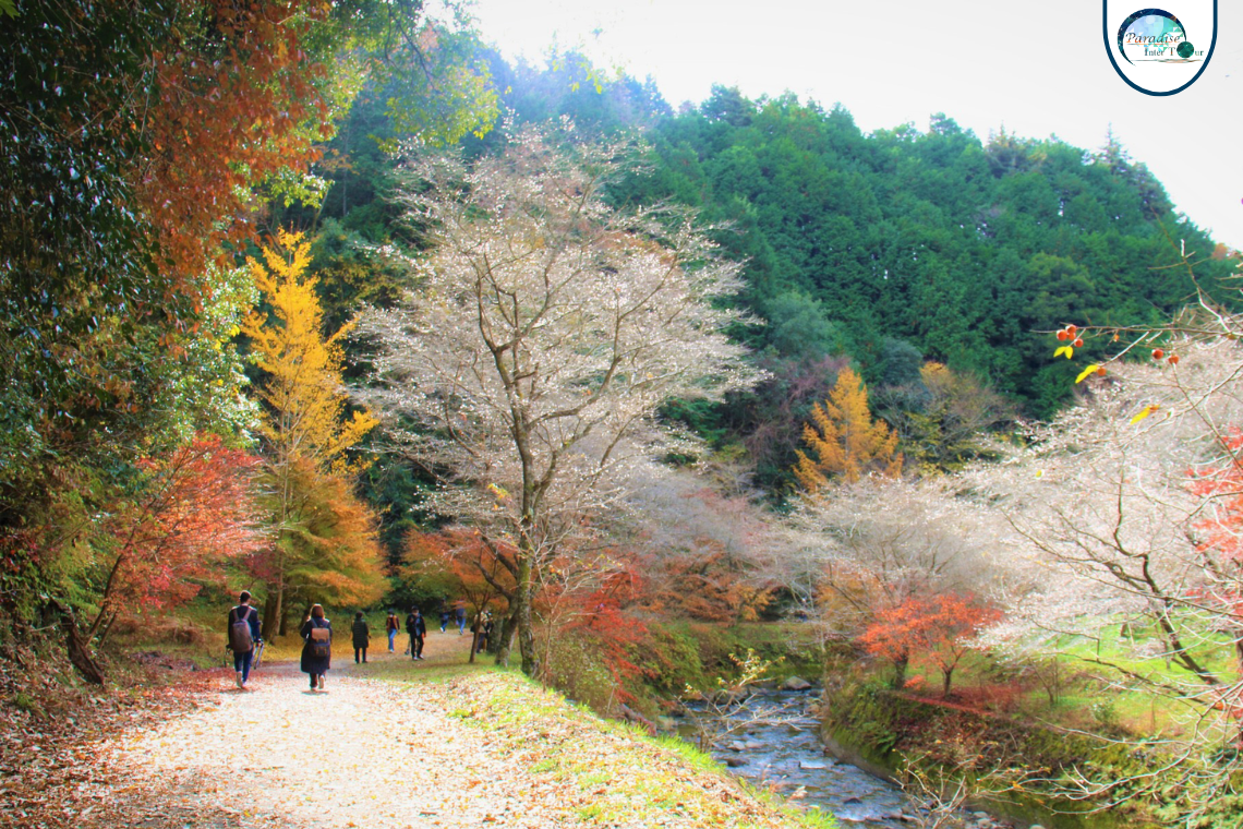 ซากุระที่บานใน Obara นั้นไม่ใช่ซากุระธรรมดา แต่เป็นพันธุ์พิเศษที่เรียกว่า ชิกิซากุระ (Shikizakura) “ซากุระสี่ฤดู” ซึ่งจะบานถึงสองครั้งต่อปี คือช่วงปลายฤดูใบไม้ผลิและฤดูใบไม้ร่วง ในฤดูใบไม้ร่วงจะเริ่มบานในช่วงปลายเดือนตุลาคม จนถึงปลายเดือนพฤศจิกายน และในครึ่งหลังนี่แหละที่ทำให้ Obara โด่งดังที่สุด เพราะมันจะบานพร้อมกับฤดูกาลแห่งใบไม้เปลี่ยนสี ภาพตรงหน้าคือกลีบซากุระสีชมพูอ่อน ที่พริ้วไหวท่ามกลางใบไม้ที่เปลี่ยนเป็นสีแดง ส้ม เหลือง เป็นภาพที่สวยเกินบรรยาย และแทบจะไม่มีที่ไหนในญี่ปุ่นเลยที่จะให้ภาพแบบนี้ได้