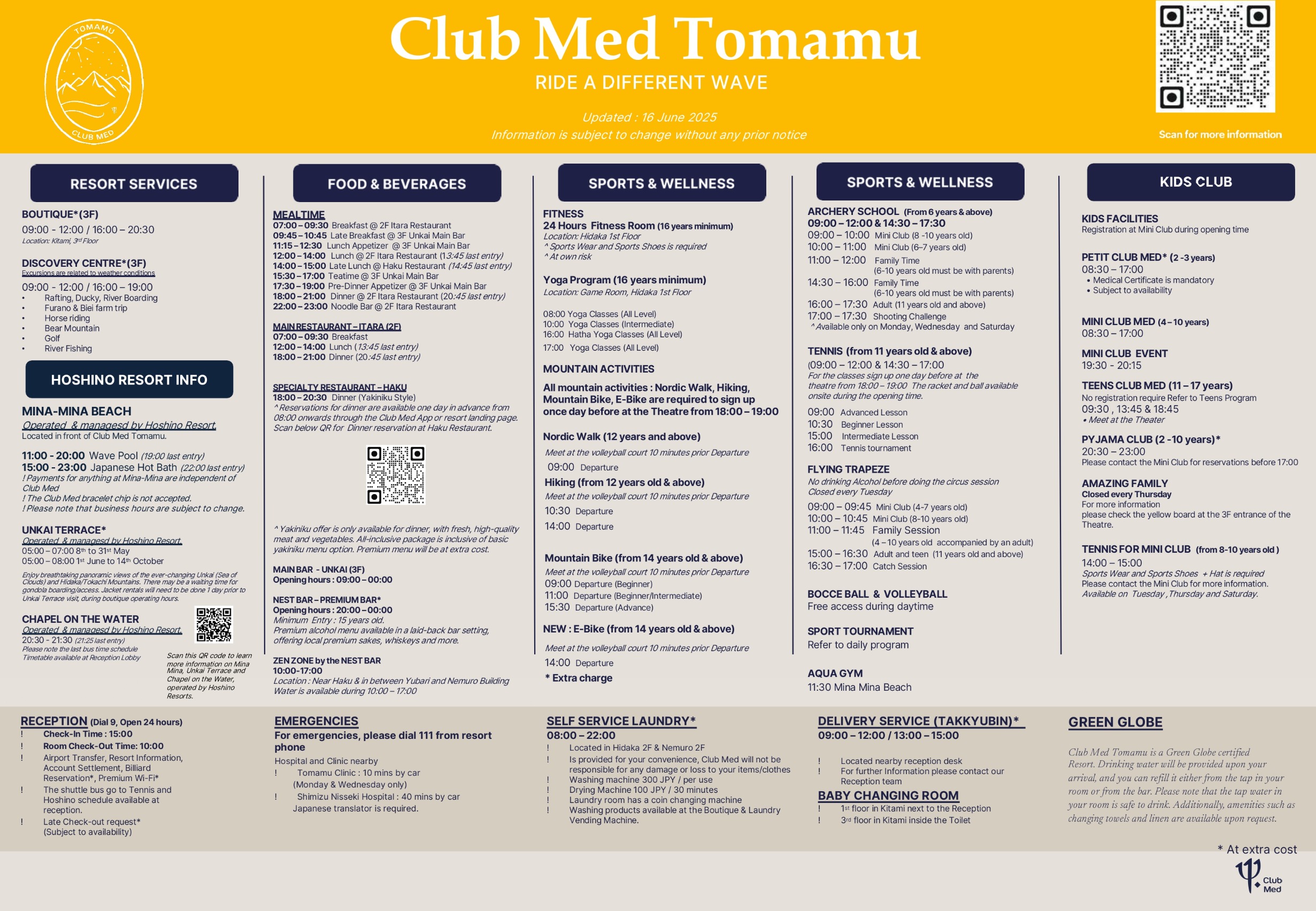 กิจกรรมทั้งหมดที่มีให้ทำที่ Club Med Tomamu ช่วงหน้าร้อน ตามที่ระบุในป้ายข้อมูลของรีสอร์ท (อัปเดตล่าสุด 16 มิถุนายน 2025) :