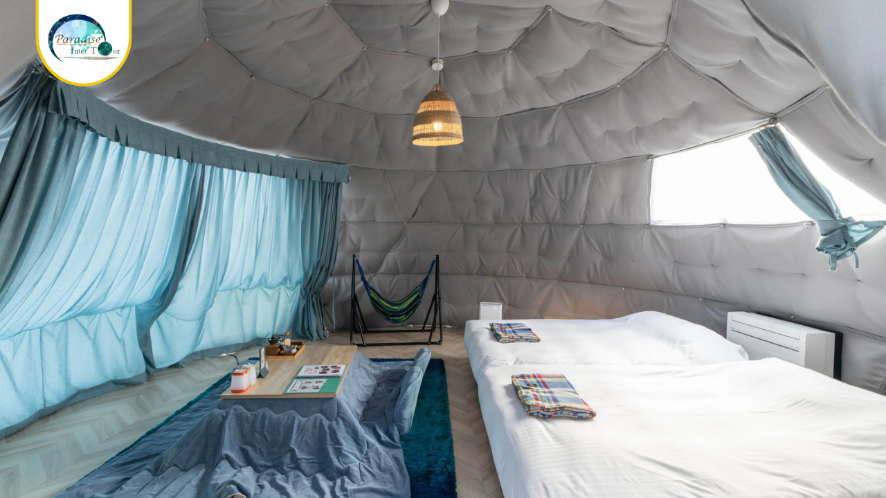 เต็นท์ที่นี่ไม่ใช่เต็นท์ธรรมดา เพราะภายในตกแต่งแบบมินิมอลสไตล์ญี่ปุ่น มีเตียงนุ่มเหมือนอยู่ในโรงแรม พร้อมฮีตเตอร์ อุปกรณ์ครบ และพื้นที่นั่งเล่นส่วนตัวที่เปิดประตูออกมาก็เจอวิวทะเลสาบทันทีที่พักสไตล์แกลมปิ้งทันสมัย แต่ใกล้ชิดธรรมชาติ