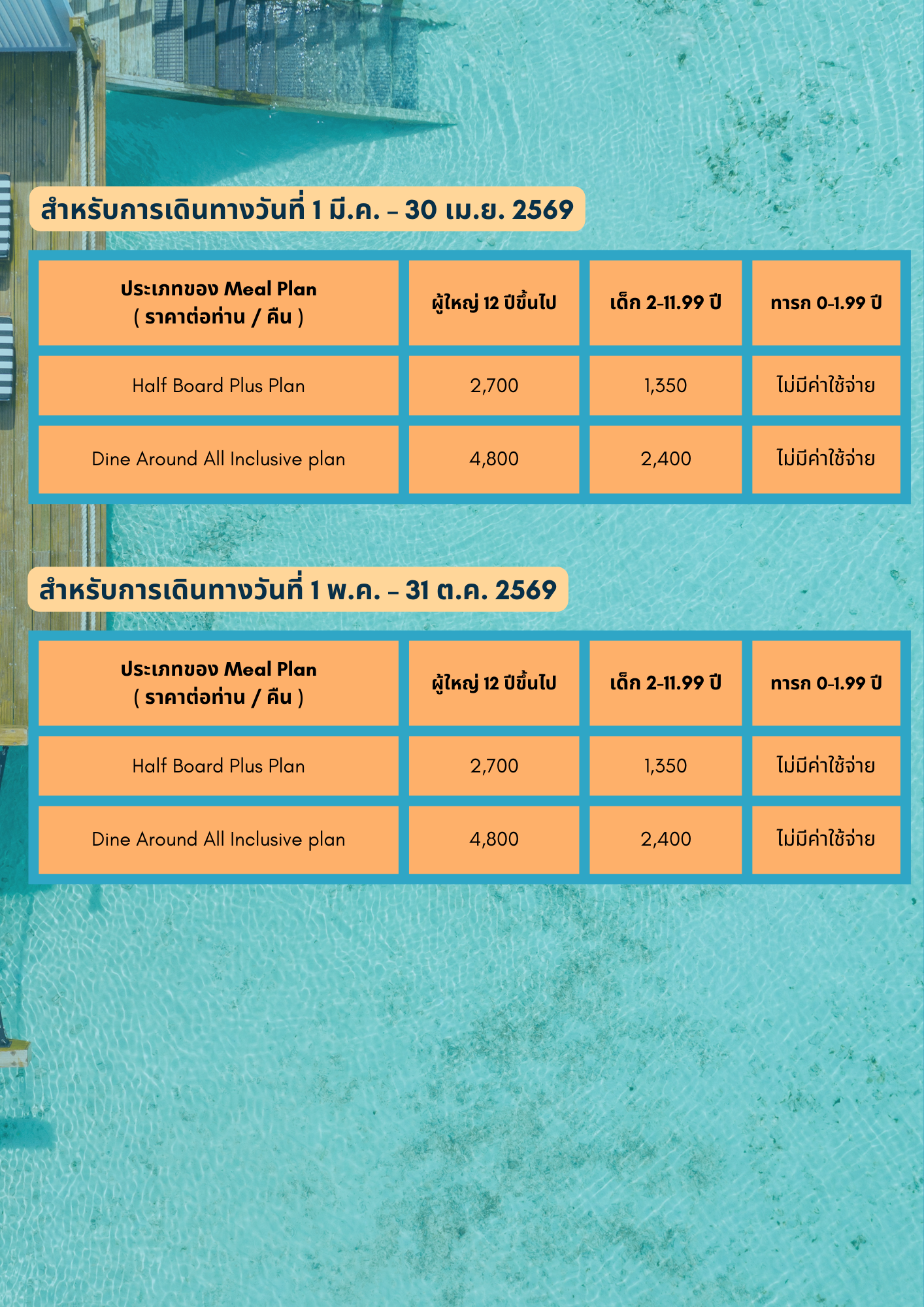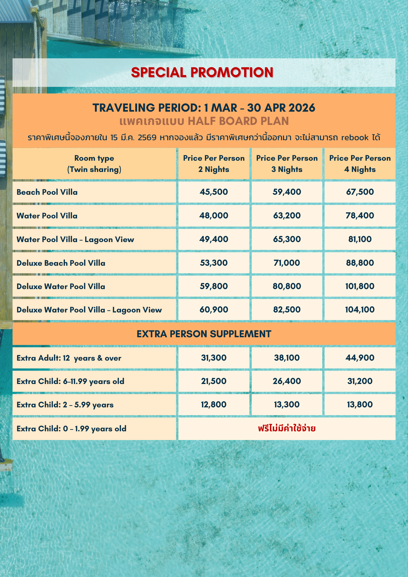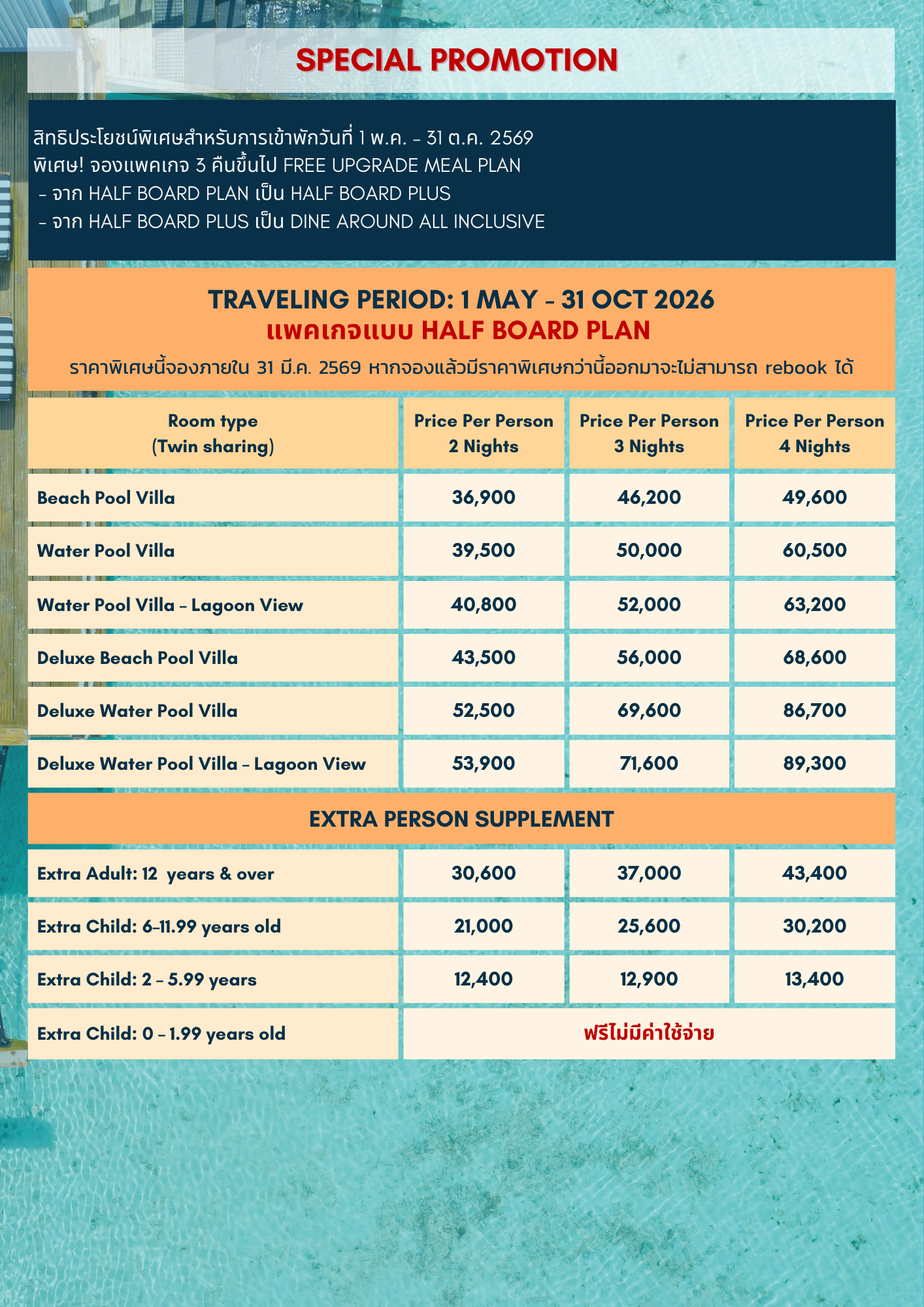 ให้บริการแบบ Half Board Plan  รวมมื้ออาหารเช้า + ค่ำ
