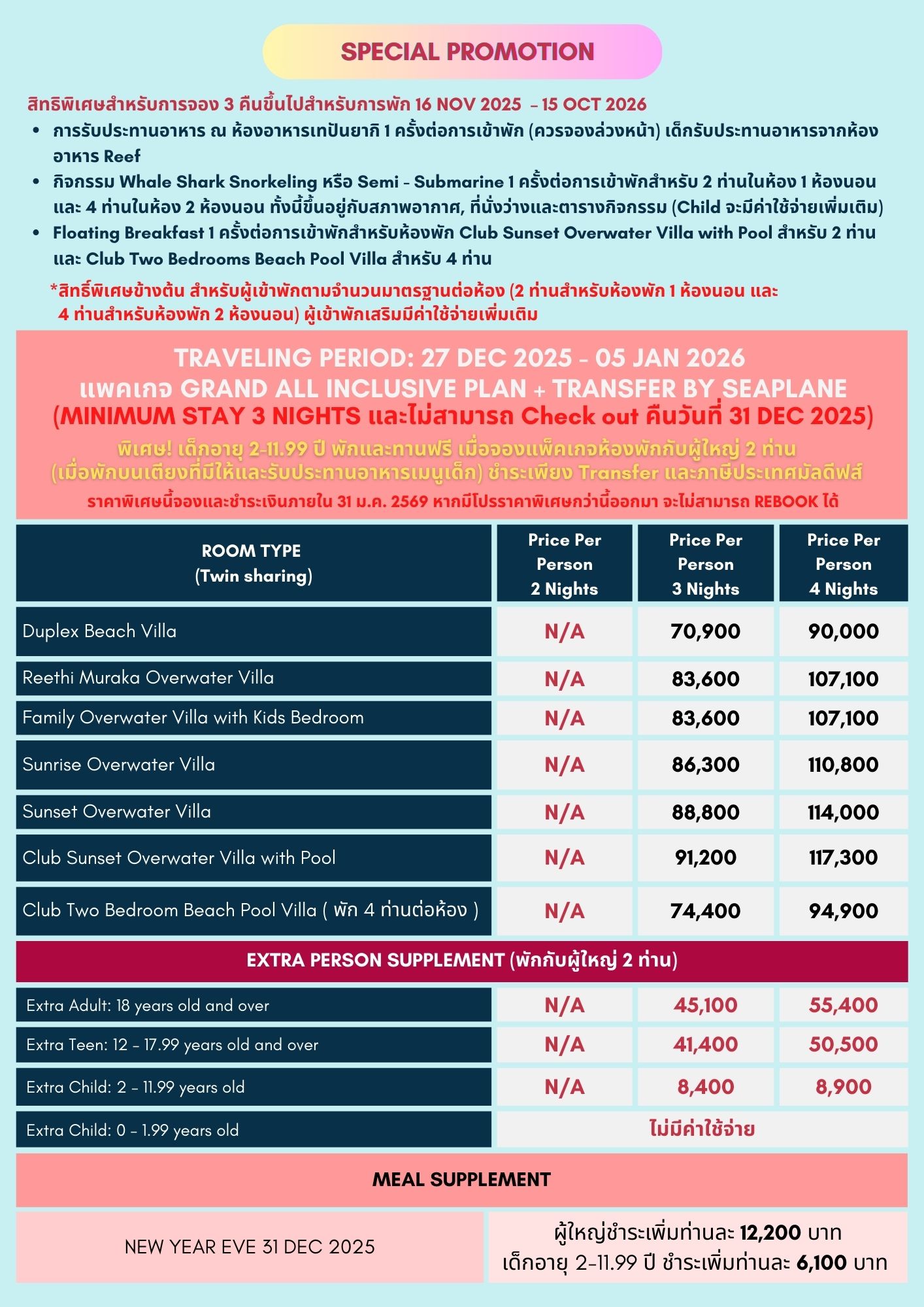 ราคาข้างต้นคำนวณจากอัตราภาษีของประเทศมัลดีฟส์ ณ อัตราปัจจุบัน (GST และภาษีอื่นๆ) หากมีการเปลี่ยนแปลงอัตราภาษีต่างๆ ของประเทศมัลดีฟส์ ณ ช่วงเวลาที่ทำการจอง บริษัทฯขอสงวนสิทธิ์ในการเปลี่ยนแปลงราคา