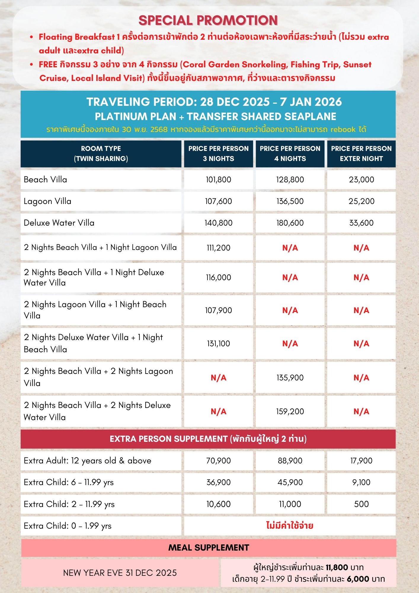 - FREE กิจกรรม 3 อย่าง จาก 4 กิจกรรม (Coral Garden Snorkeling, Fishing Trip, Sunset Cruise, Local Island Visit) ทั้งนี้ขึ้นอยู่กับสภาพอากาศ, ที่ว่างและตารางกิจกรรม