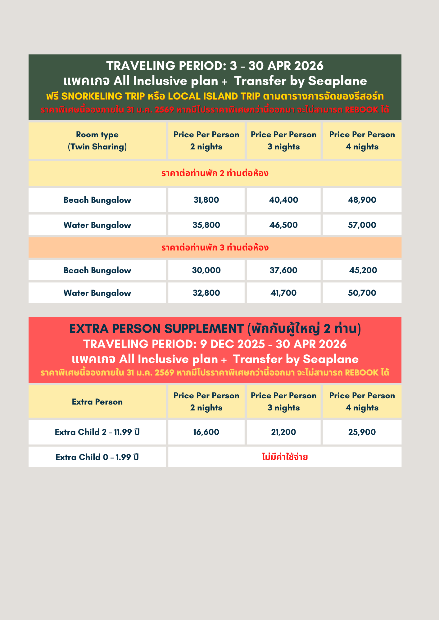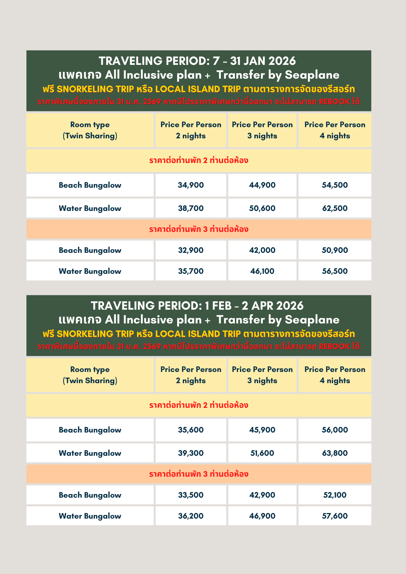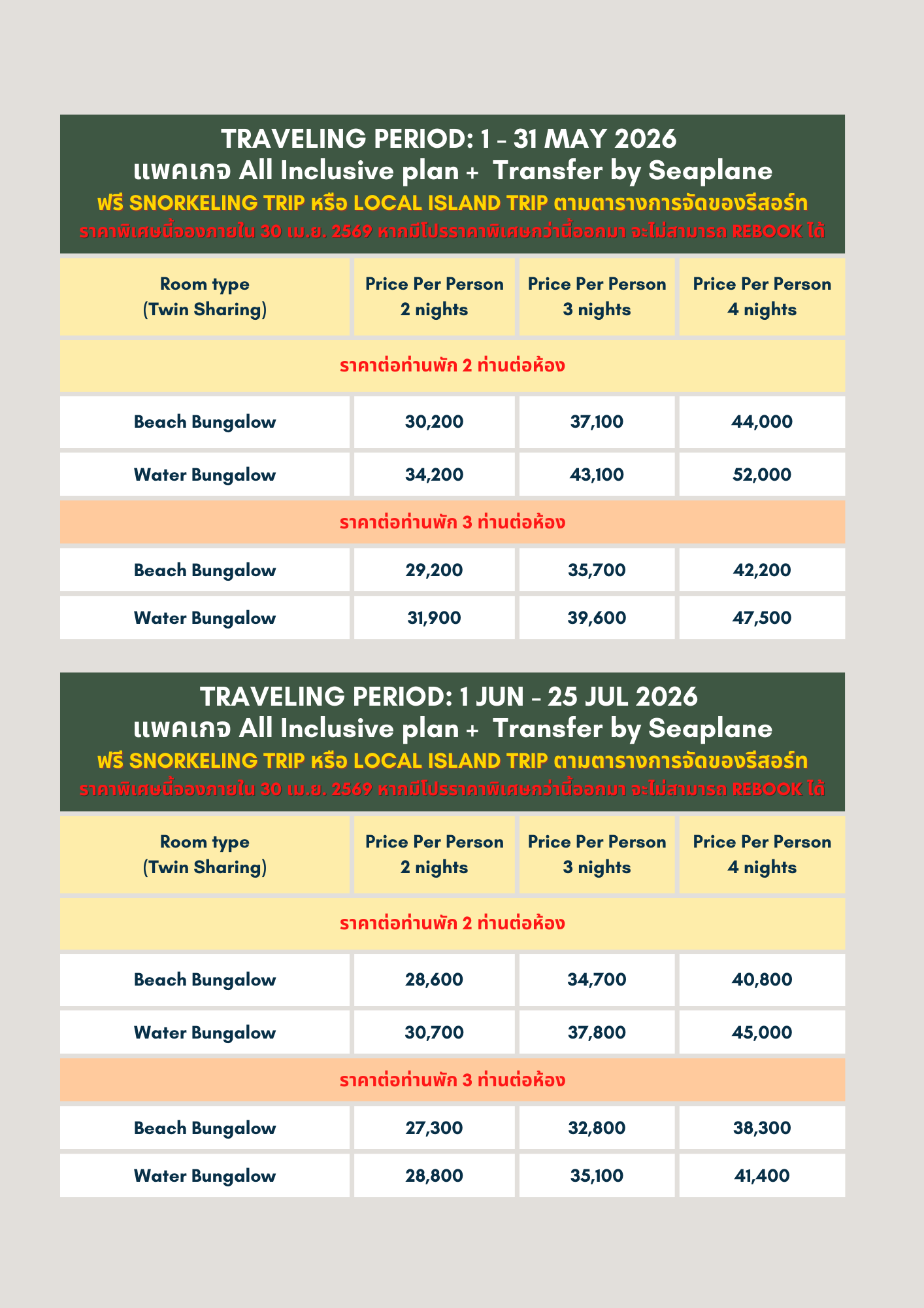 - All Inclusive Package อาหารทุกมื้อ เช้า กลางวัน เย็น