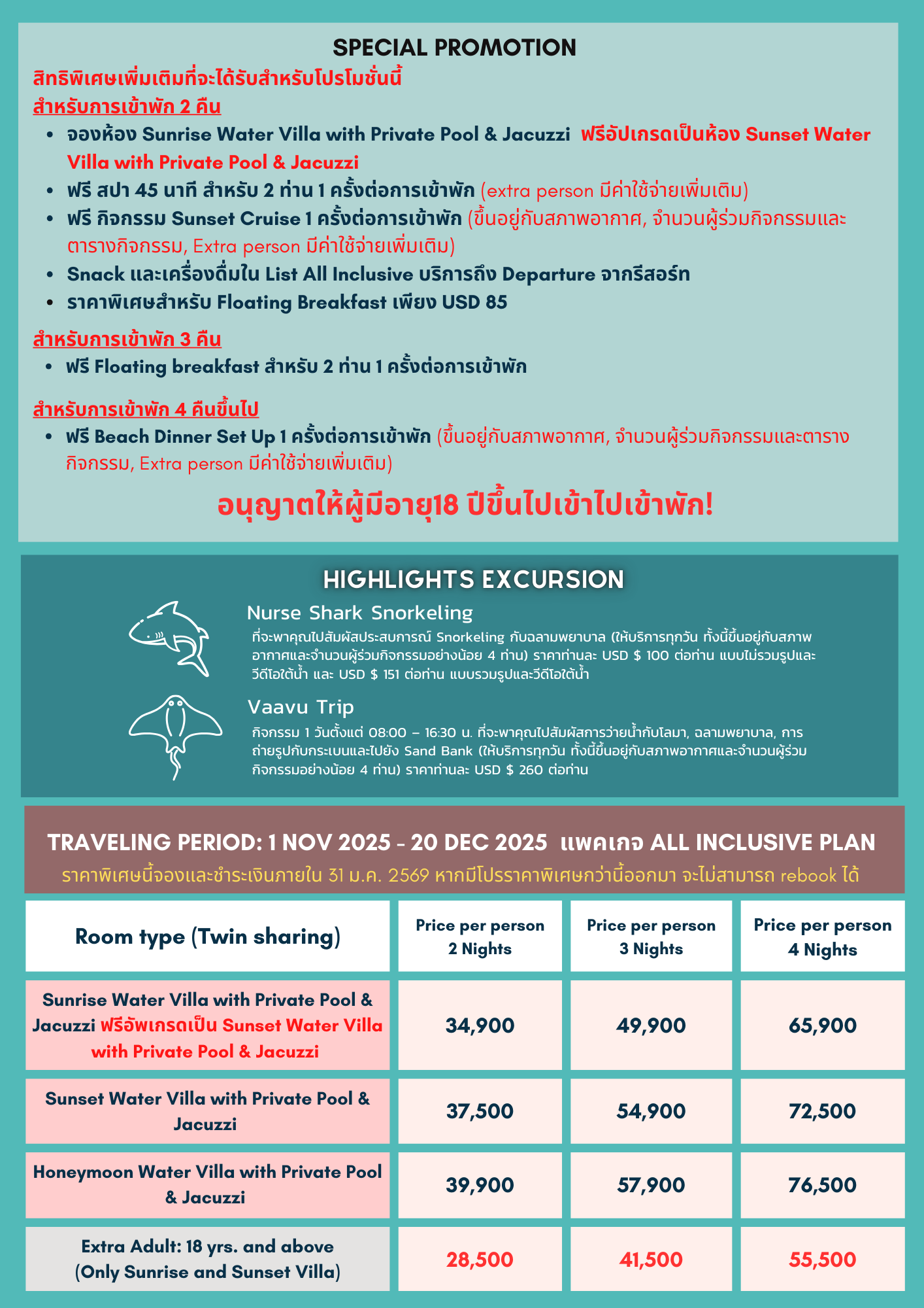 หมายเหตุ Adaaran Prestige Vadoo ไม่อนุญาตให้เด็กอายุต่ำกว่า 18 ปี เข้าพัก
