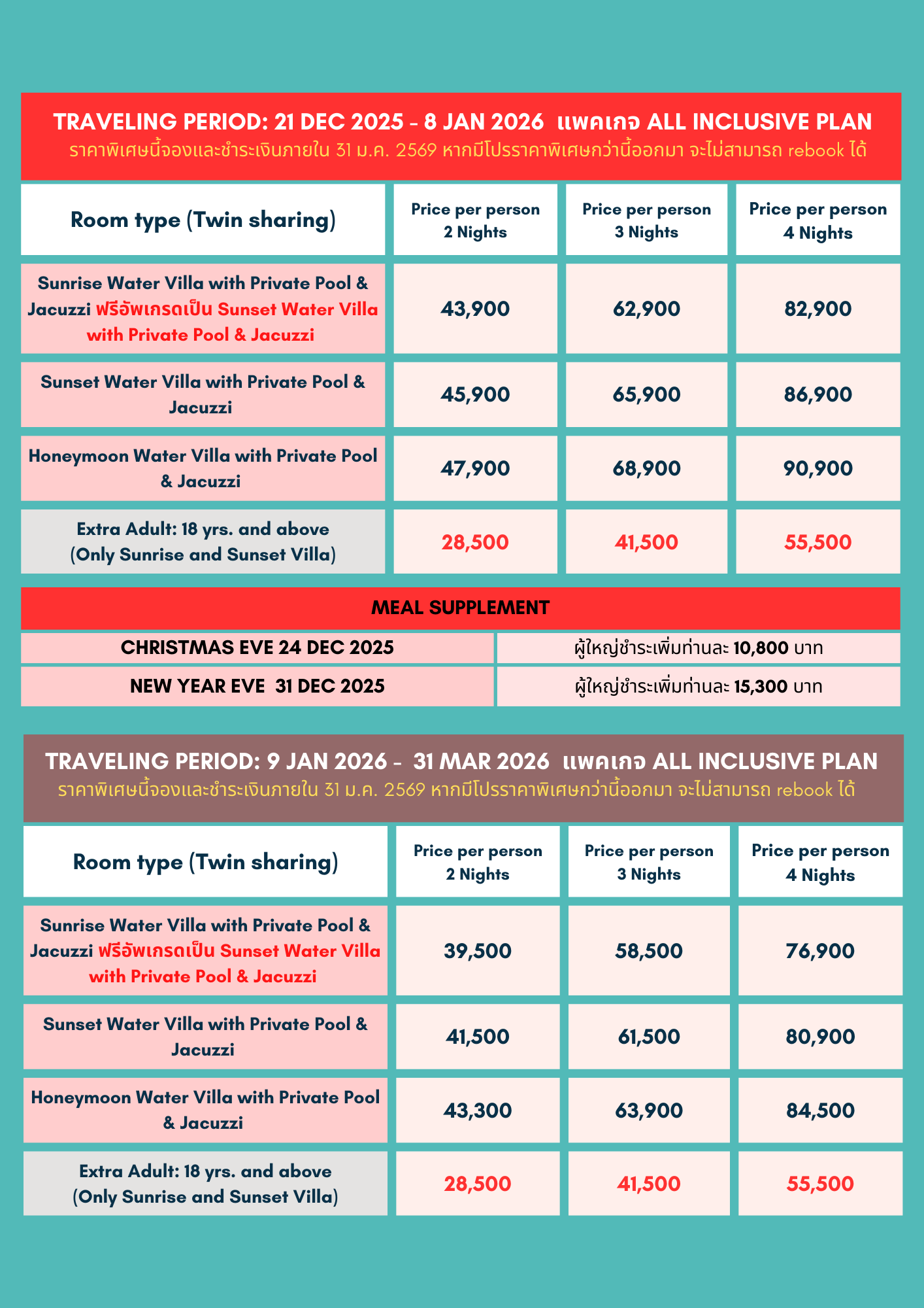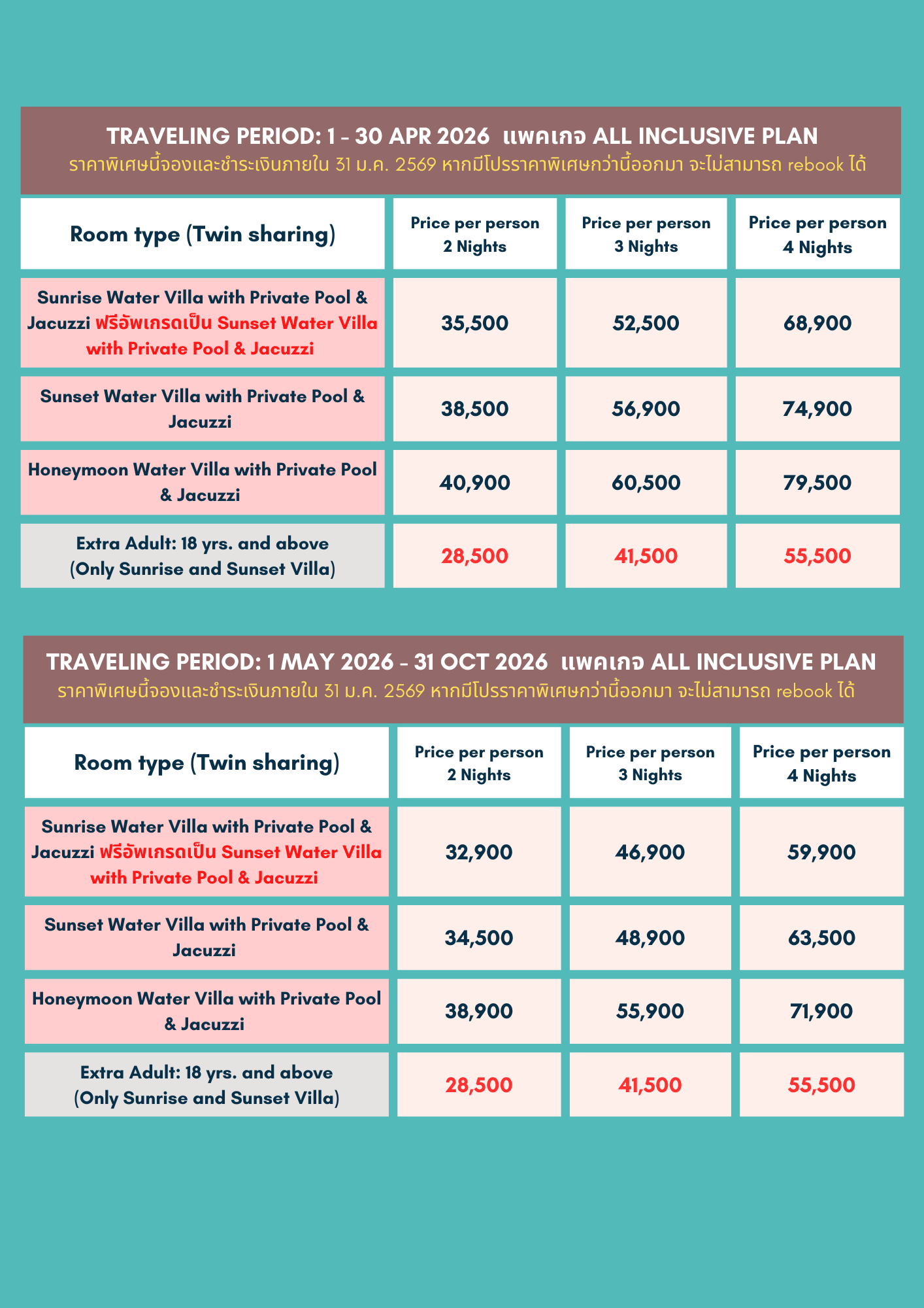 - ราคาข้างต้นเป็นราคา ณ ปัจจุบัน หากมีโปรโมชั่นใหม่ไม่สามารถ re-book ได้