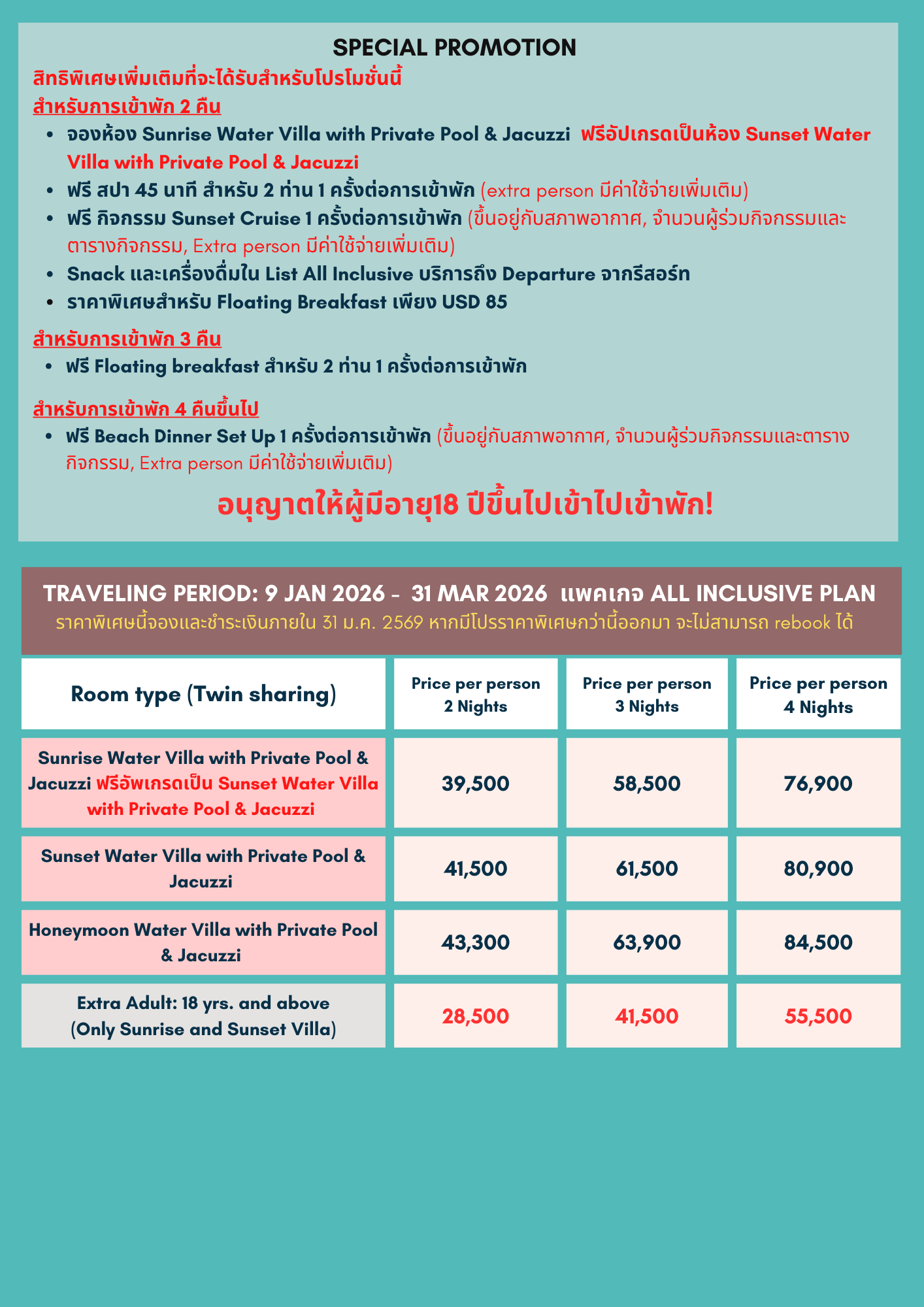 สำหรับการเข้าพัก 4 คืนขึ้นไป- ฟรี Beach Dinner Set Up 1 ครั้งต่อการเข้าพัก (ขึ้นอยู่กับสภาพอากาศ, จำนวนผู้ร่วมกิจกรรมและตารางกิจกรรม, Extra person มีค่าใช้จ่ายเพิ่มเติม)