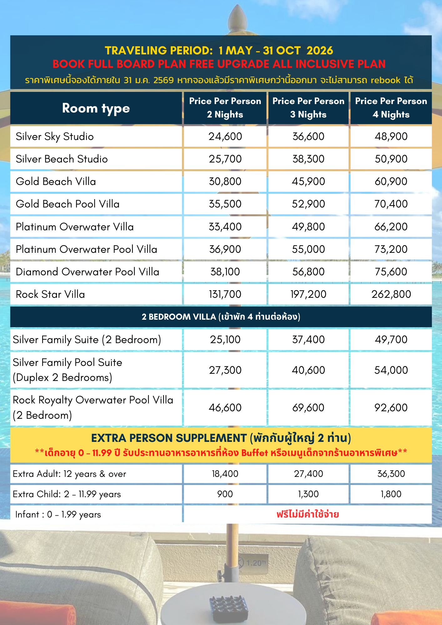 HARD ROCK มัลดีฟส์ All inclusive รวมอาหารและเครื่องดื่มทุกมื้อไม่อั้น ดื่มได้ตั้งแต่เช้าจรดดึก ราคาพิเศษ แพ็คเกจเที่ยวมัลดีฟ ต้องที่ HARD ROCK MALDIVES เดินทางสู่รีสอร์ทด้วยเรือสปีดโบ้ท Hard Rock Hotel Maldives เป็นรีสอร์ทที่เพิ่งเปิดใหม่ได้ไม่นาน อยู่ภายใต้เครือสิงห์ เอสเตส (ประเทศไทย) รีสอร์ทชื่อดัง ในประเทศมัลดีฟส์ เดินทางไม่ไกลจากสนามบินมาเล่ไปยังรีสอร์ท โดย Speedboth เพียง 15 นาที ห้องพักพร้อมอาหาร All Inclusive อาหารเช้า International Buffet รวมถึงยังมีห้องอาหารชื่อดังให้เลือกสรร เช่น Hard Rock Café, Ministry of Crab ที่จะทำให้วันพักผ่อนของคุณไม่น่าเบื่ออีกต่อไป อีกทั้งห้องพักที่ออกแบบได้อย่างสวยงาม กิจกรรมต่างๆที่เกี่ยวข้องกับดนตรีตาม Concept ของ HARD ROCK เอาไว้รอนักท่องเที่ยวทั้งแบบคู่รักและครอบครัวให้ไปสัมผัส ที่สำคัญเด็กสามารถเข้าพักห้องกลางน้ำได้อีกด้วย