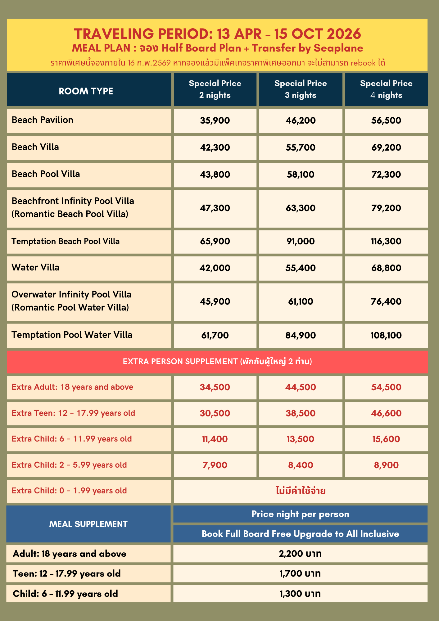 - การเดินทางสู่รีสอร์ทนี้ต้องเดินทางด้วยเครื่องบินSeaplane (หยุดให้บริการหลังเวลา 15.00น.)