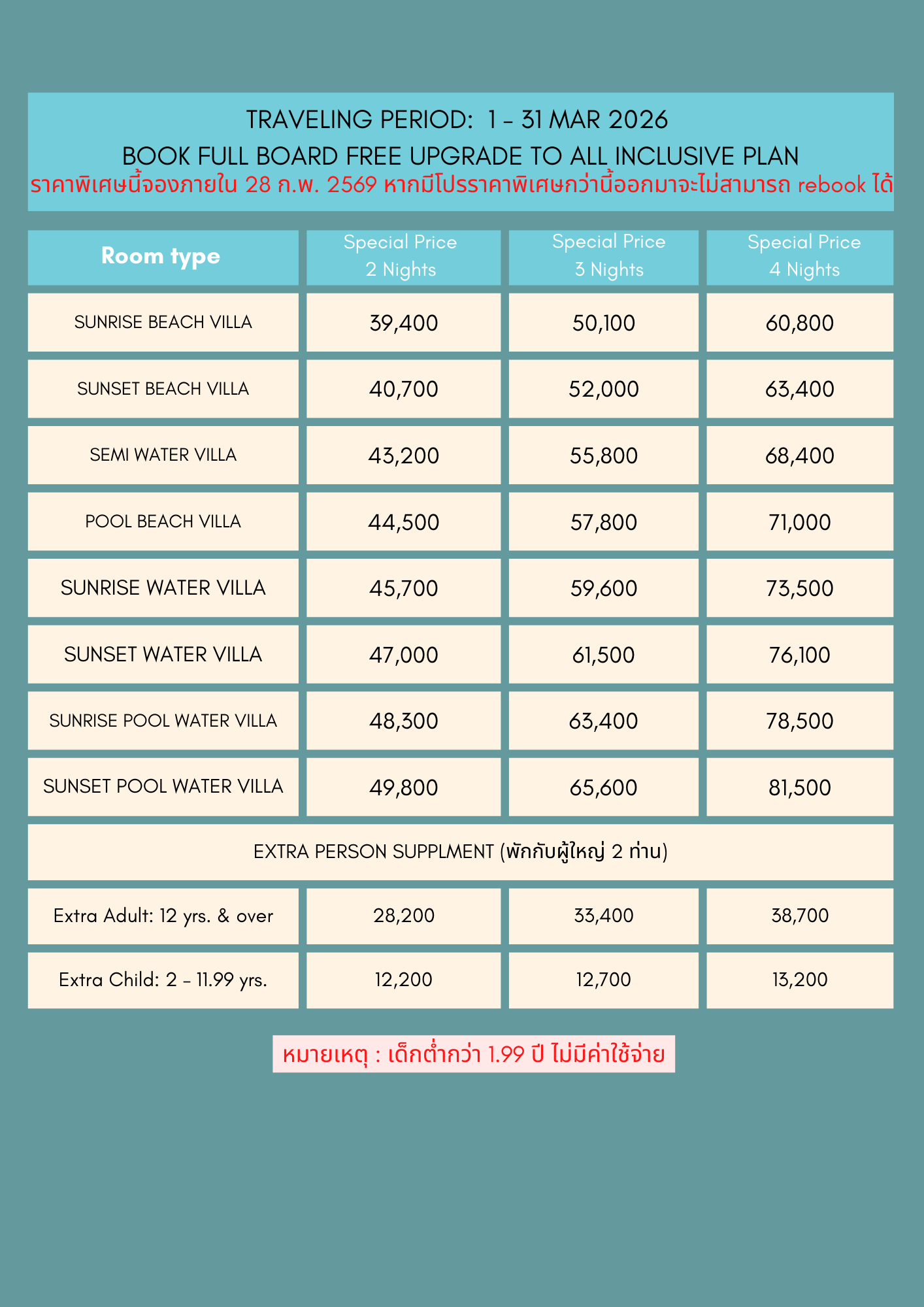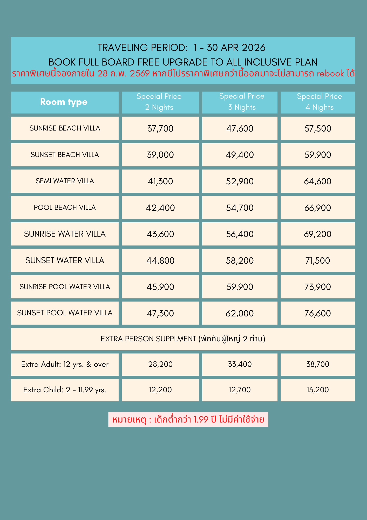 - เด็กอายุ 2-11.99 ปี จำนวน 1 ท่านพักและทานฟรี เมื่อจองแพ็คเกจห้องพักกับผู้ใหญ่ 2 ท่าน ชำระค่าภาษีมัลดีฟส์และ Transfer สำหรับการพักในห้อง Sunrise/ Sunset Water Villa และSunrise/ Sunset Pool Water Villa