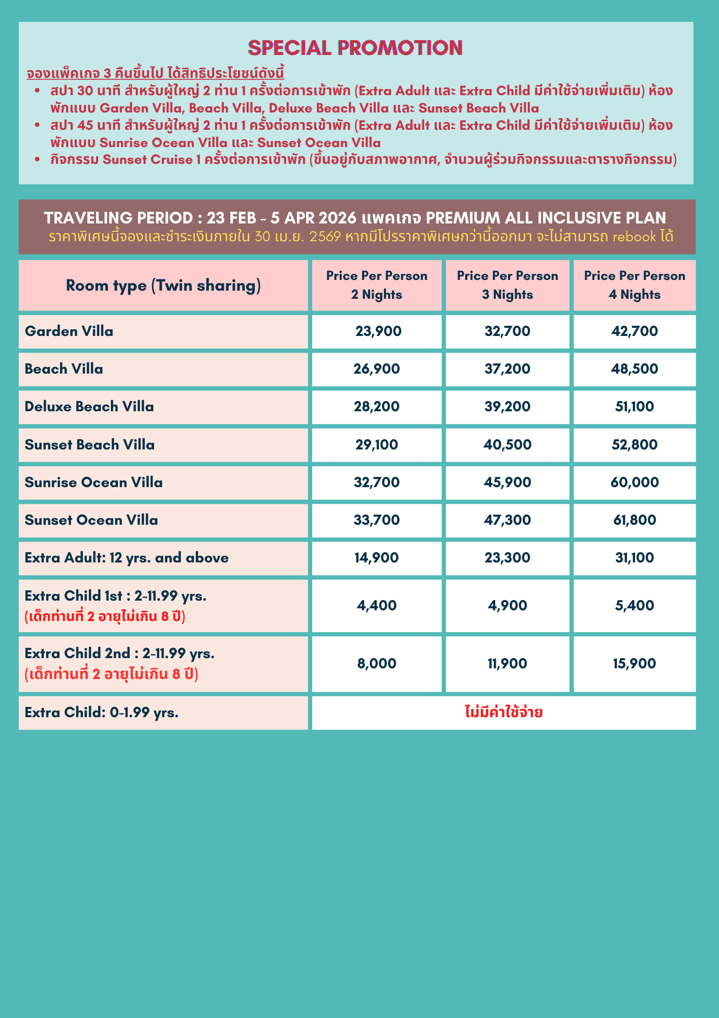 • สปา 30 นาที สำหรับ 2 ท่าน 1 ครั้งต่อการเข้าพัก (Extra Adult และ Extra Child มีค่าใช้จ่ายเพิ่มเติม) ห้องพักแบบ Garden Villa, Beach Villa, Deluxe Beach Villa และ Sunset Beach Villa