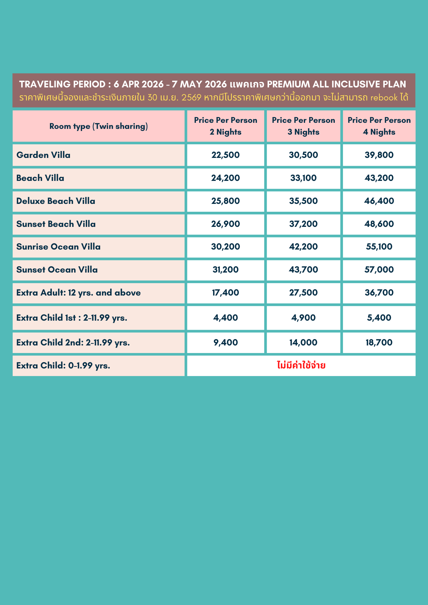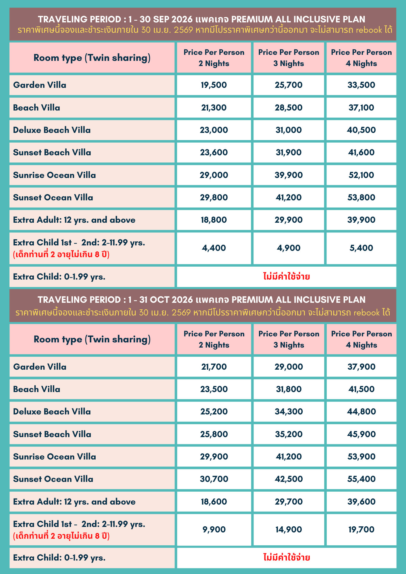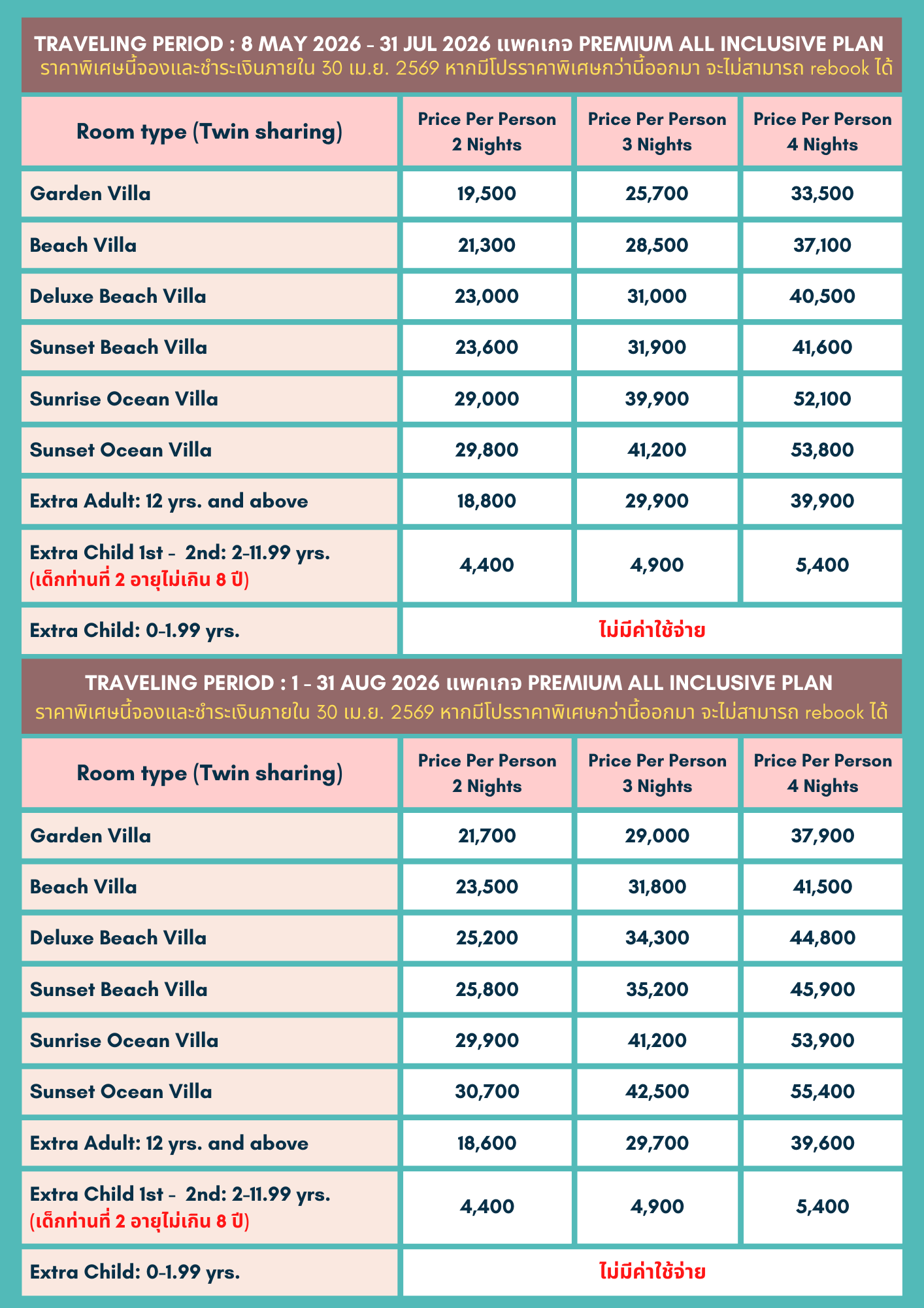 • ราคาข้างต้นเป็นราคา ณ ปัจจุบัน หากมีโปรโมชั่นใหม่ไม่สามารถ re-book ได้
