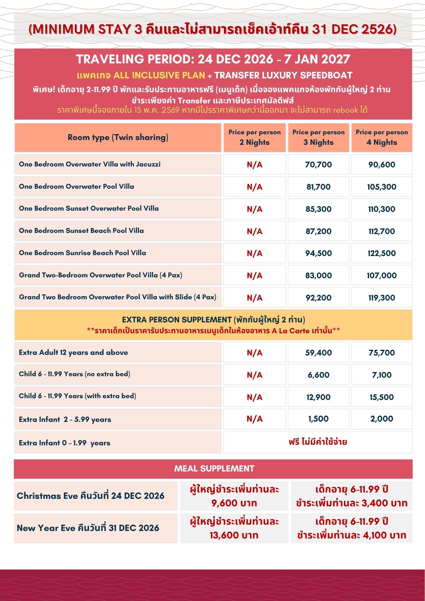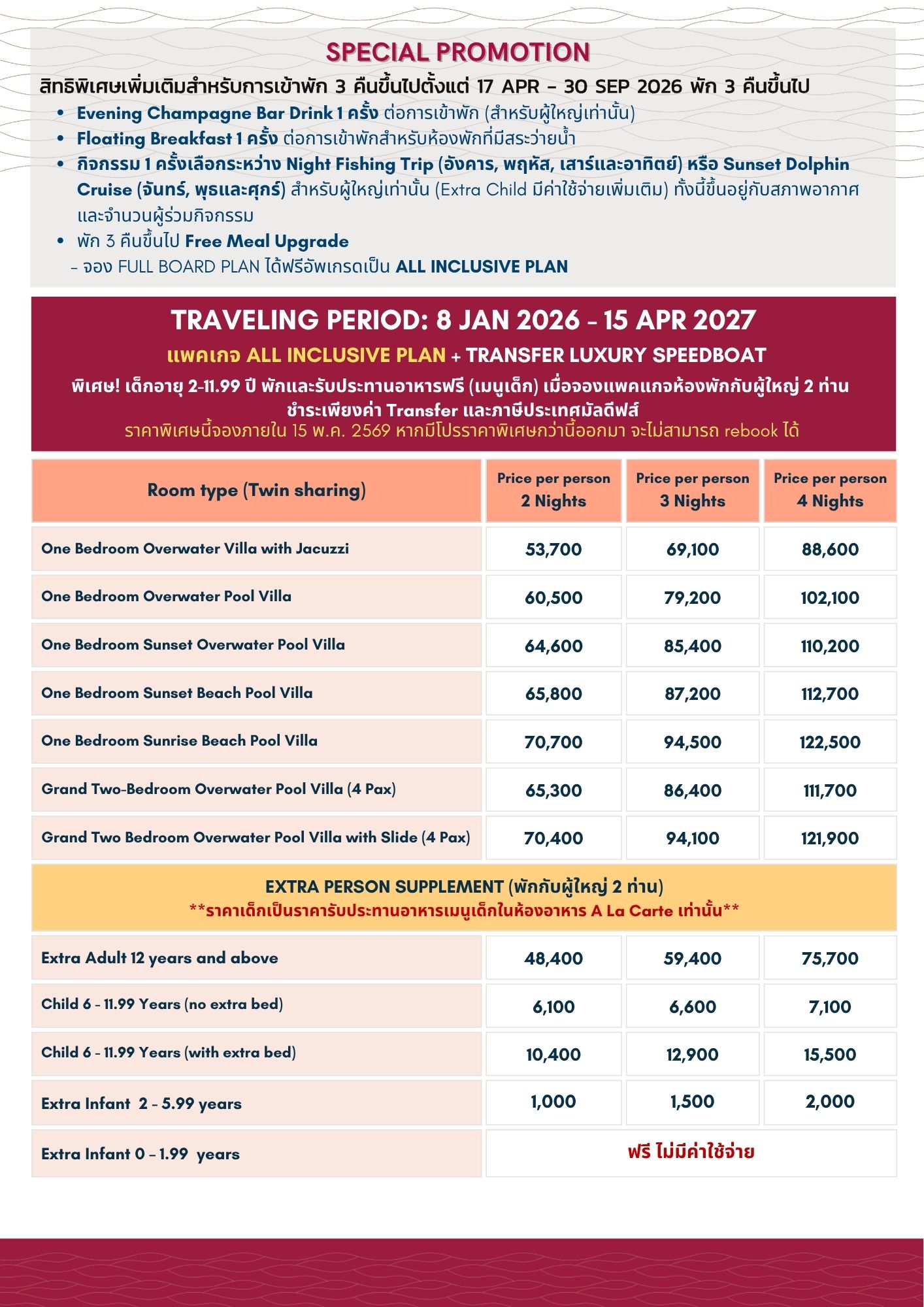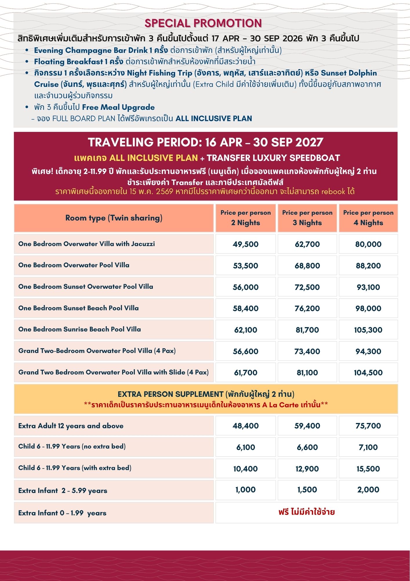 - จอง FULL BOARD PLAN ได้ฟรีอัพเกรดเป็น ALL INCLUSIVE PLAN